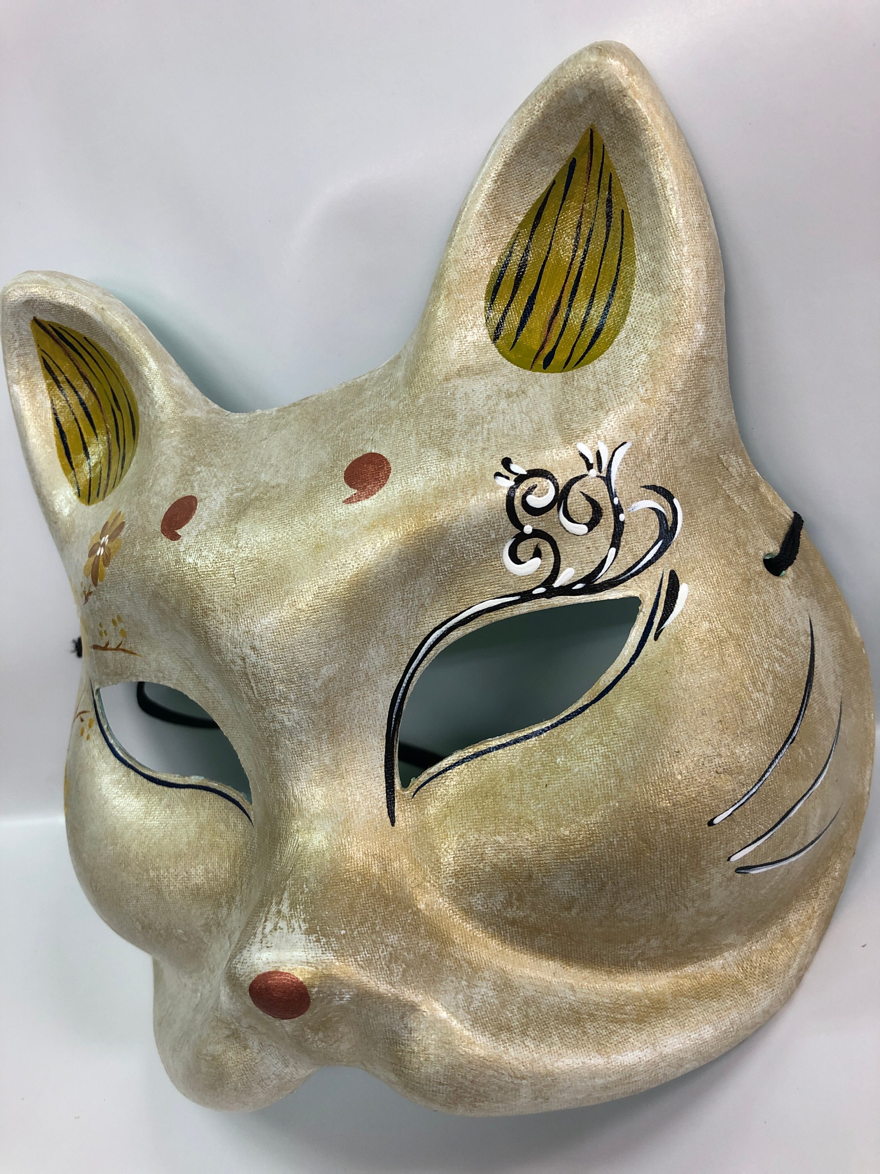 お面は1枚ずつ、手描きで仕上げており一点物となっております。どの仔も、持って下さった方の多幸を願って、豊川稲荷のお膝元、門前の「一年狐」店主が仕上げております。