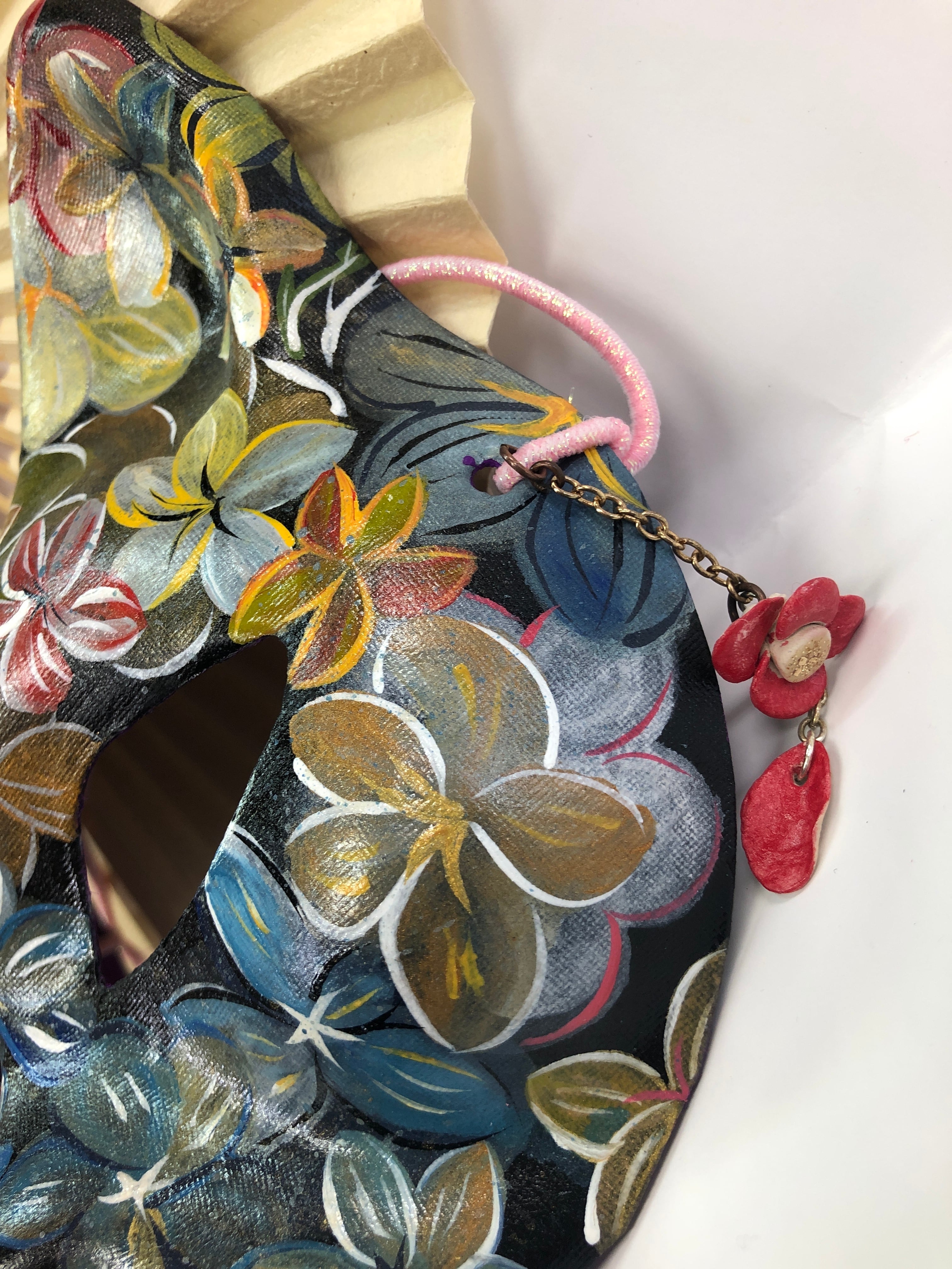 向かって右側のゴム紐のところにも粘土で手作りした椿の花チャームが着いています。
