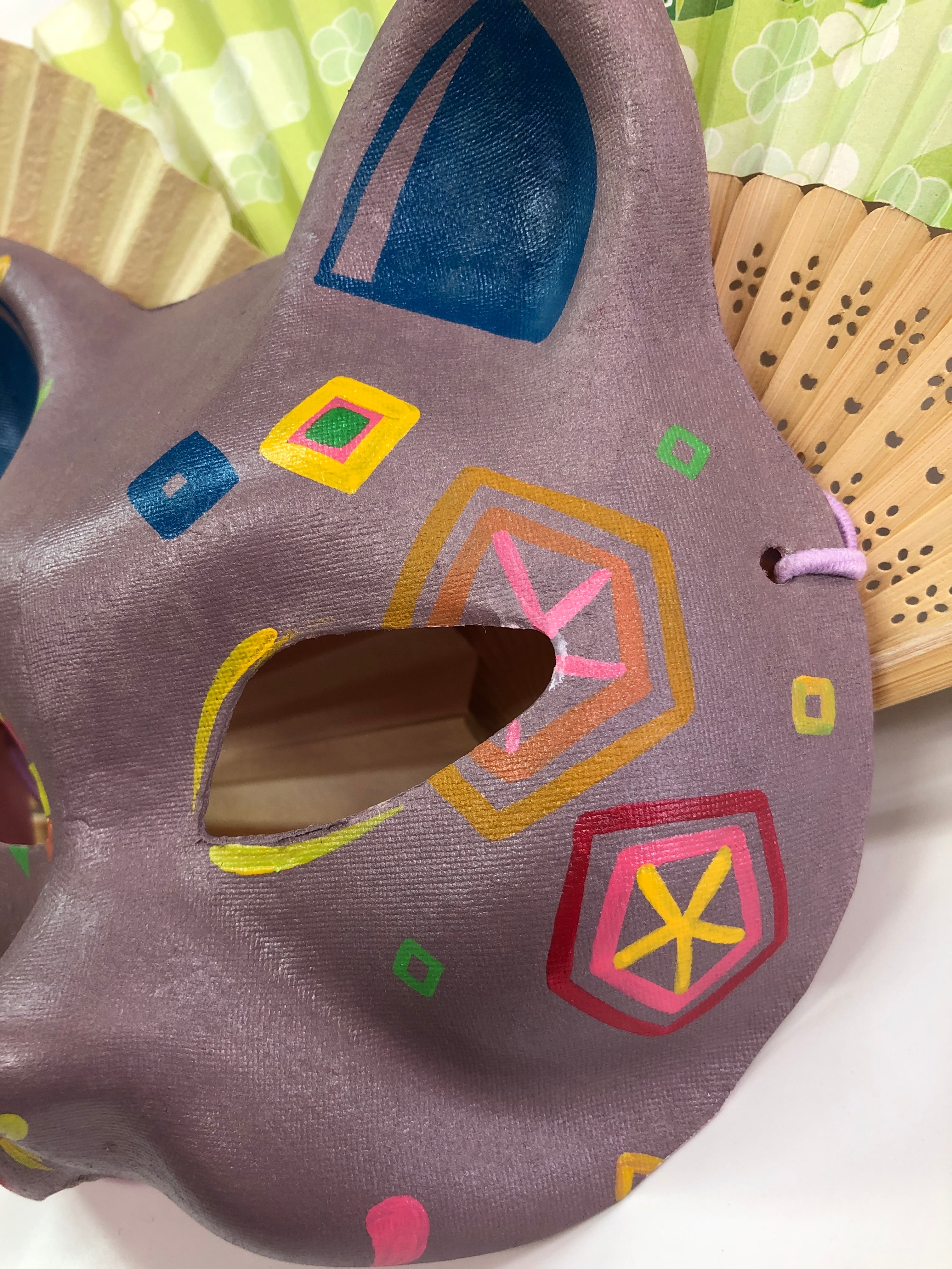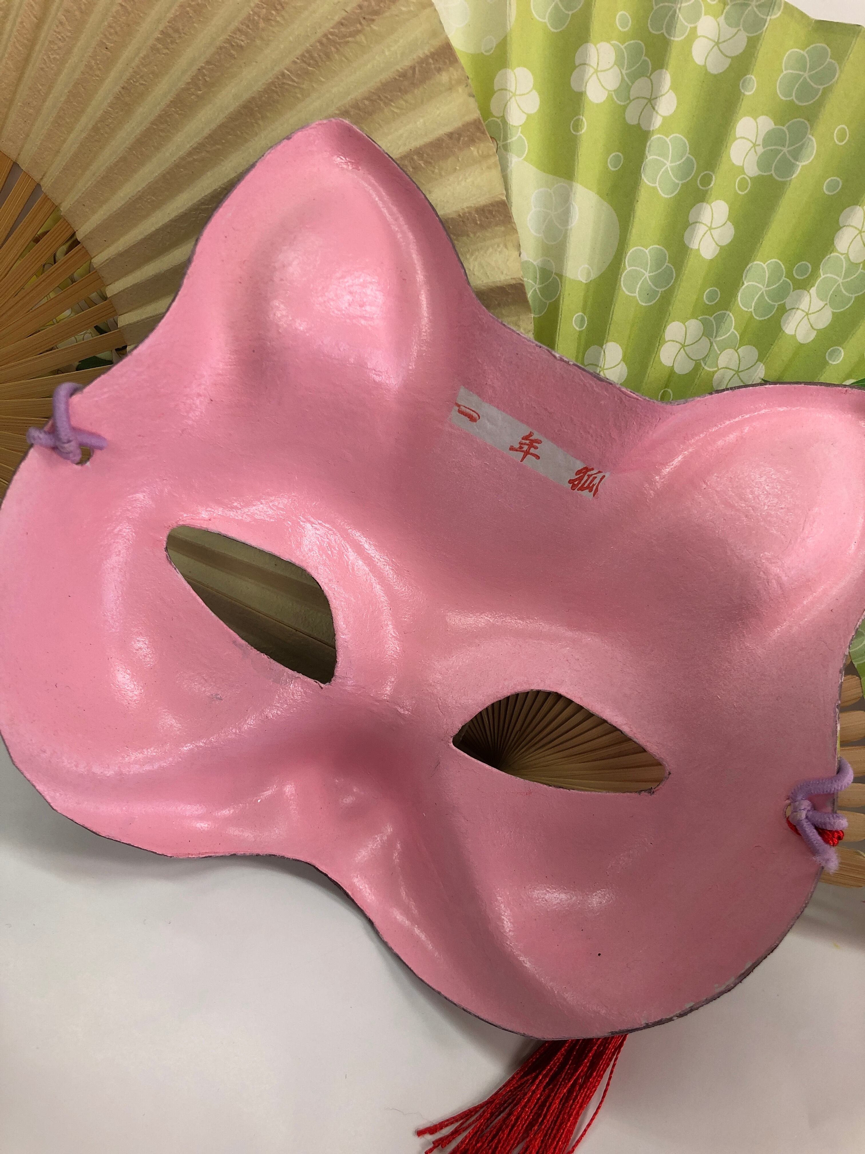 落ちついたくすみカラーは大人っぽくて人気があります。お面自体の形も丸みのある、ころんとした形なので身につけてもらうと可愛いく見えます。