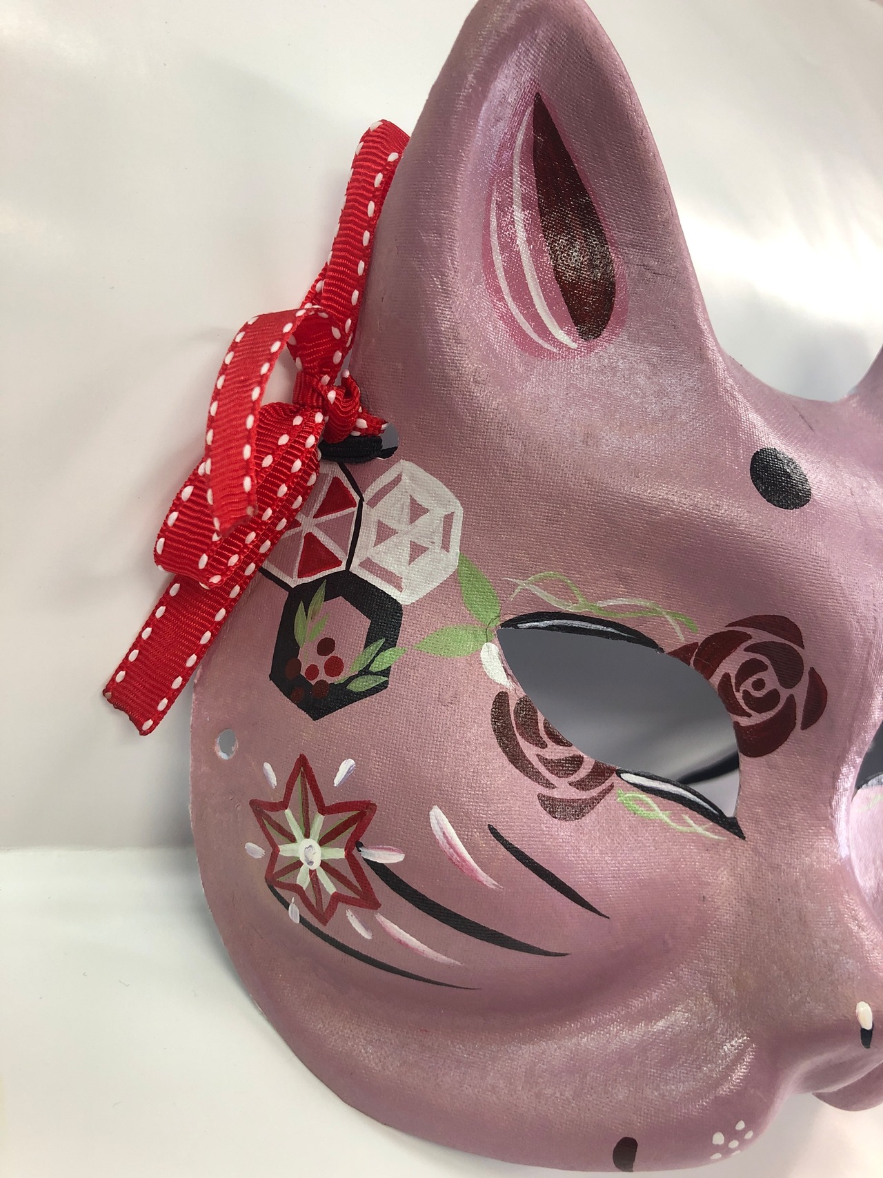 お面の形を狐ハーフ面で作っているので、猫ハーフよりも耳が長く吊り目でスタイリッシュな印象に仕上がっています。