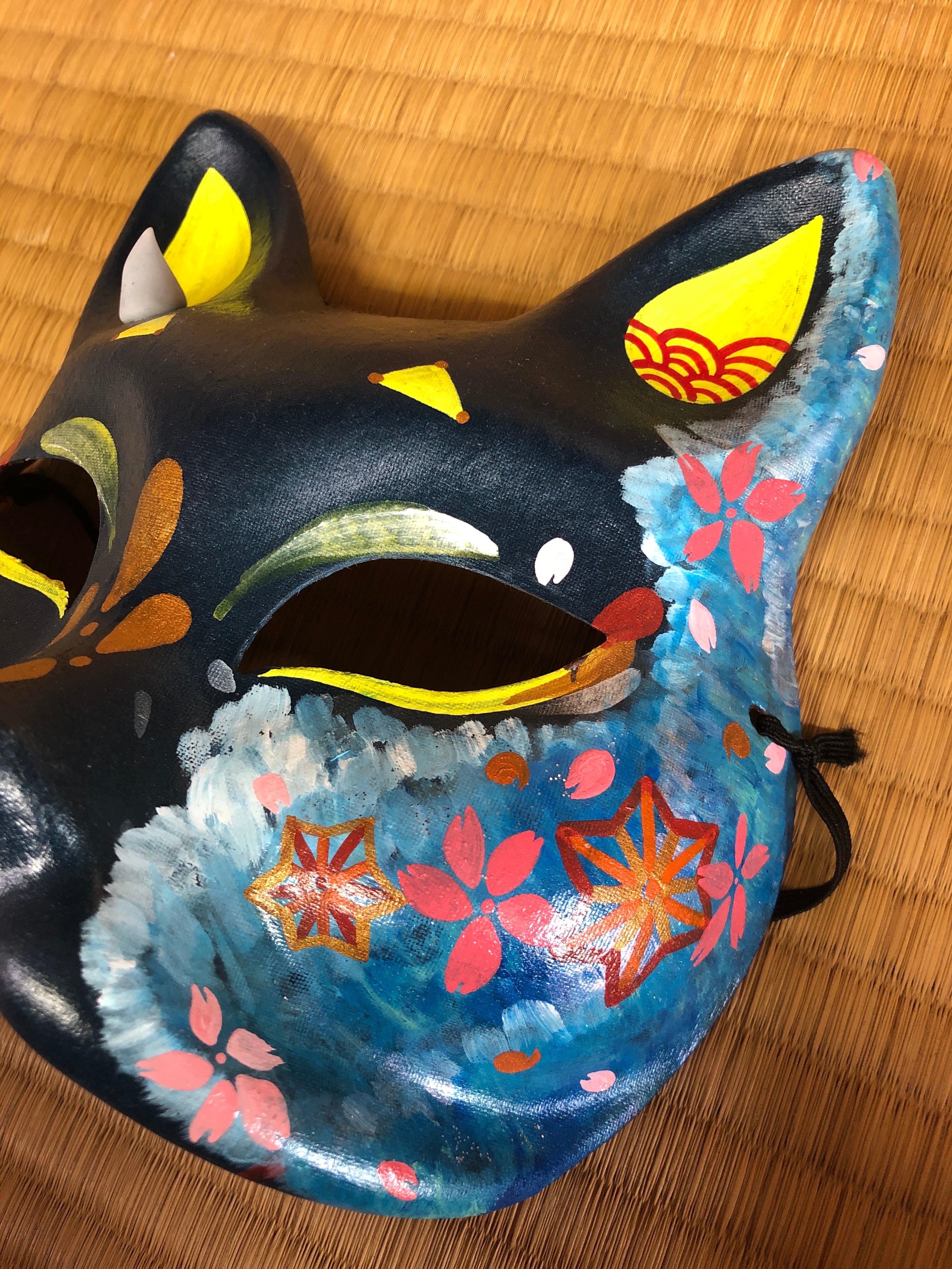 お面の素材はパルプ(紙)で角は樹脂粘土で手作りしています。絵付は手描きしていて、一点物です。
