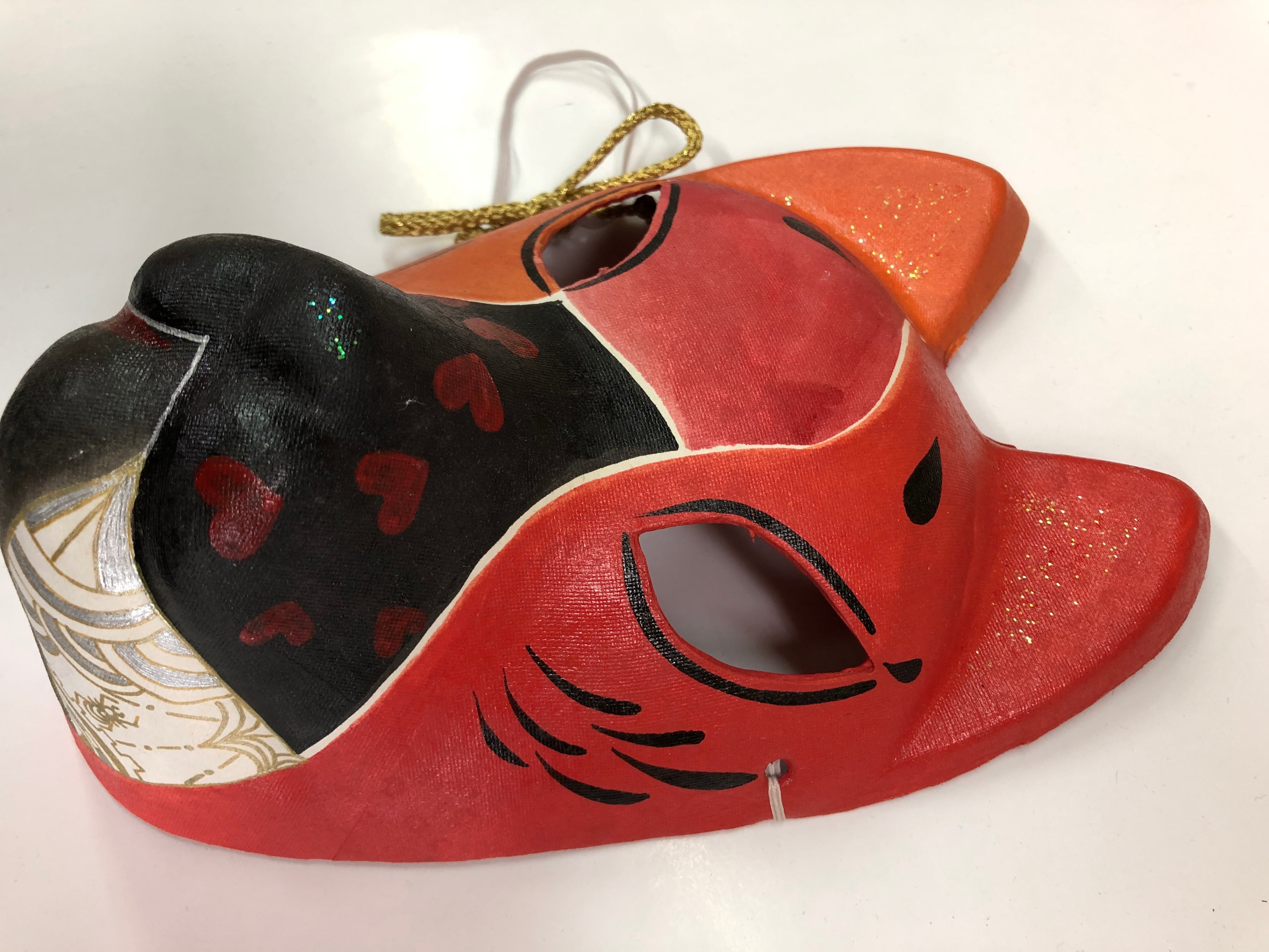 お面自体に同系色で塗り分けをしてペンで絵をのせた個性的なお面です。